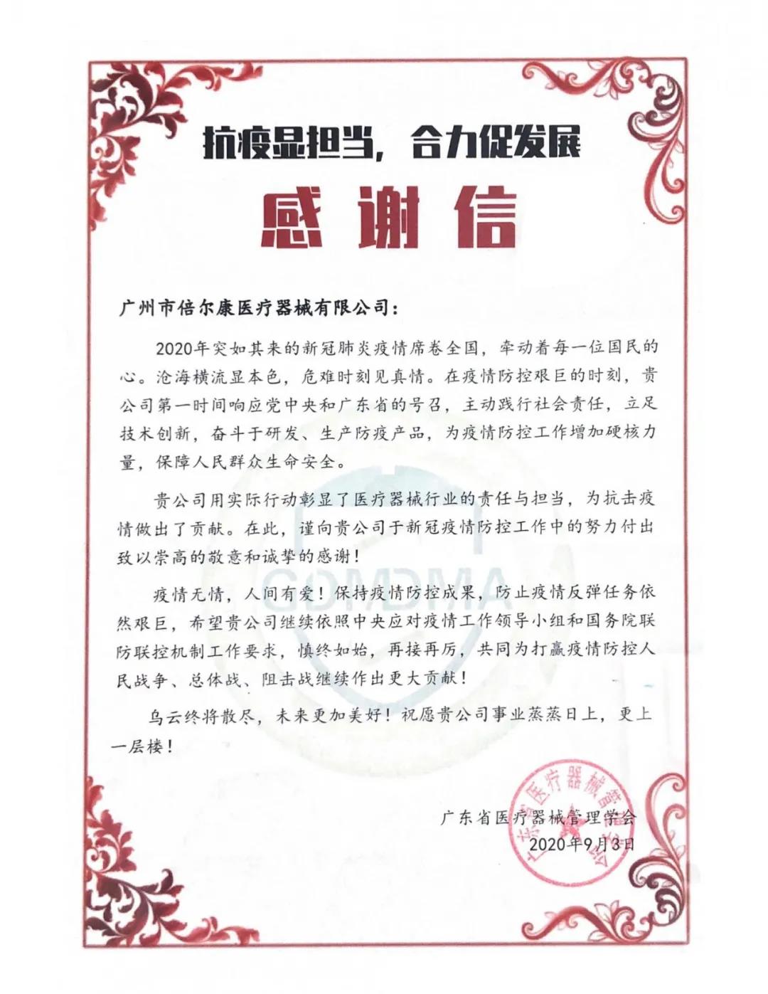 在現(xiàn)場(chǎng),倍爾康收到了廣東省醫(yī)療器械管理學(xué)會(huì)的感謝信——對(duì)倍爾康在疫情期間加班加點(diǎn)保質(zhì)量促生產(chǎn),發(fā)揚(yáng)廣東省醫(yī)療器械大愛無疆的奉獻(xiàn)精神,助力一線防控表示感謝!