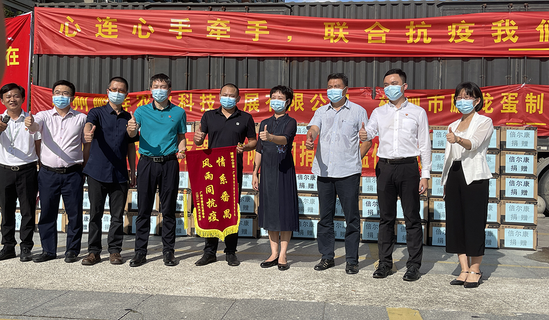 番禺區(qū)各領導與倍爾康總經(jīng)理郭智超捐贈儀式上合照